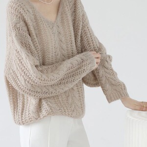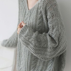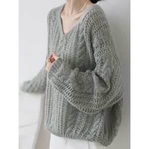 大码法式慵懒风软糯马海毛毛衣女春季温柔气质V领镂空针织衫上衣