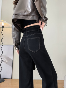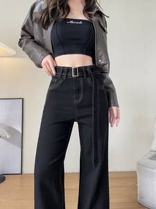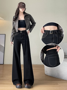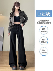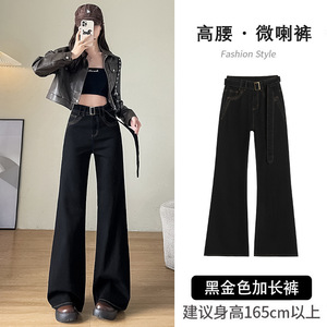 黑金色腰带阔腿牛仔裤女秋季2025年高腰显瘦弹力九分宽版大喇叭裤