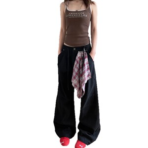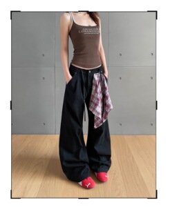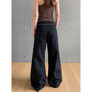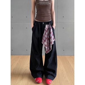 【送挂饰】可拆方巾弯刀牛仔裤女抽绳拼接嘻哈百搭褶皱复古阔腿裤