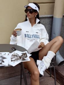 街头潮流字母印花立领卫衣秋季女运动风设计感宽松长袖半拉链卫衣