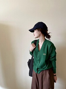 韩版宽松V领针织开衫女秋季新款学院风简约绿色感毛衣潮