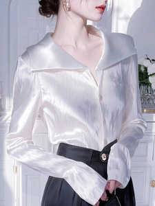 高级感白色长袖翻领缎面衬衫女2025早春新款独特别致法式职业衬衣