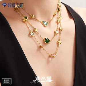 谜丽 新款切面玻璃石空心爱心锁骨链不锈钢镀18k真金时尚珠宝项链