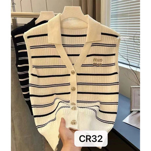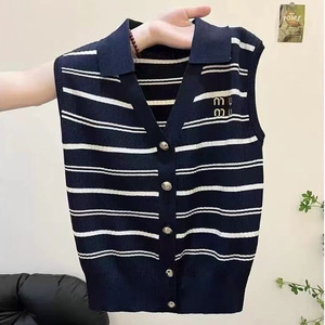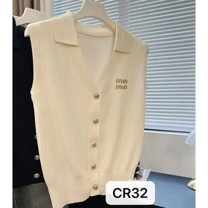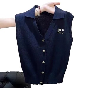 韩版小V领轻奢金属扣字母刺绣无袖针织背心毛织开衫外贸跨境工厂