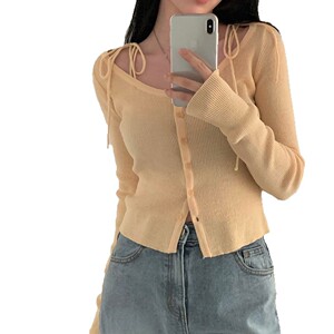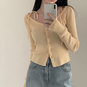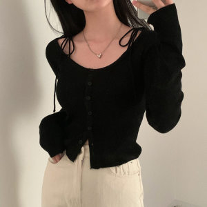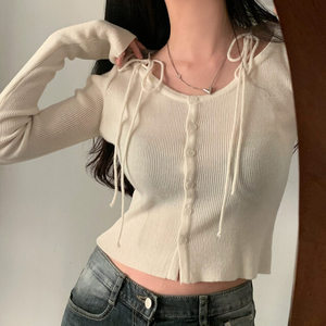 韩国ins2025秋季新款法式系带长袖针织衫女修身显瘦单排扣上衣