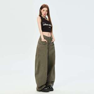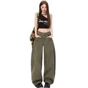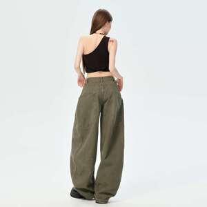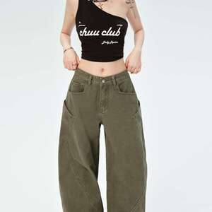 批发军绿色美式复古设计感大口袋弯刀牛仔裤女拖地阔腿裤