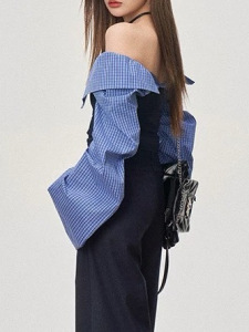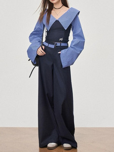 【1月15号新品】WESTAYONE一字肩条纹拼接显瘦修身上衣学院休闲裤