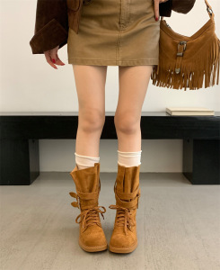 新款欧美风牛反绒骑士靴~圆头系带皮带扣中跟大筒靴秋冬中筒靴女