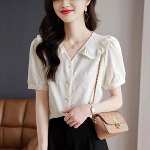 高档法式绣花雪纺衬衫女2025夏新洋气木耳边娃娃领短袖清爽潮上衣