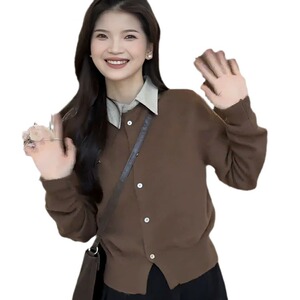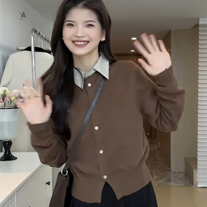 设计感气质翻领假两件毛衣针织衫女2025新款早秋长袖内搭打底上衣
