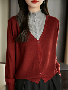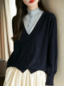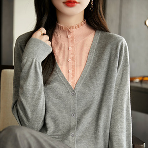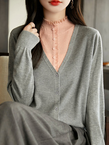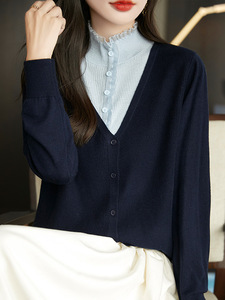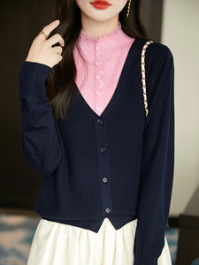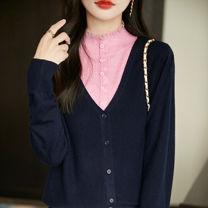 2025年新款秋冬女精纺羊毛拼接假两件气质知性荷叶领羊毛开衫