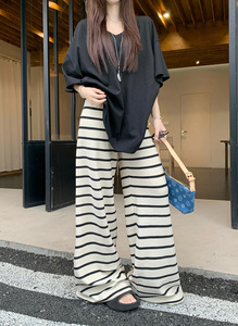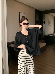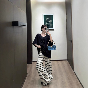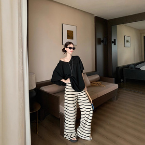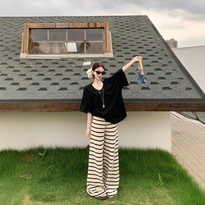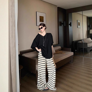 松弛感慵懒时尚套装女夏季宽松T恤遛弯条纹阔腿裤两件套