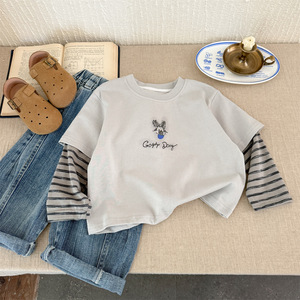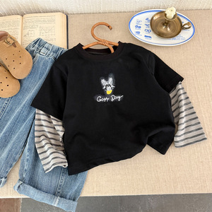 2025秋季新款韩版儿童条纹撞色假两件T恤男女童卡通印花圆领上衣