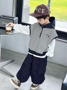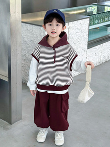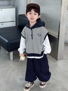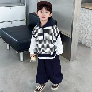 男童秋装套装2025新款春秋儿童卫衣条纹马甲三件套酷帅时髦工装裤