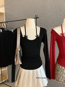 WGWE6874#撞色圆领长袖T恤女秋季紧身显瘦上衣内搭打底衫