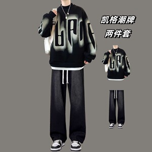 美式潮牌圆领卫衣套装男秋冬青少年加绒加厚卫衣搭配牛仔裤两件套