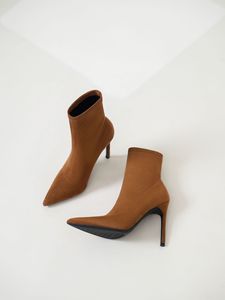 弹力靴4色~百搭尖头细跟弹力靴高跟鞋短靴女靴中筒单里靴子黑底