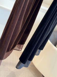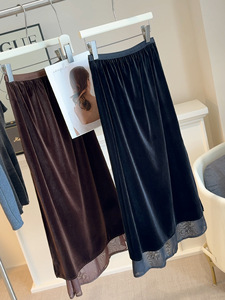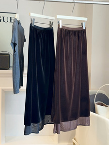 拼接网纱黑色丝绒半身裙女韩系秋2025新款松紧高腰显瘦开叉直筒裙