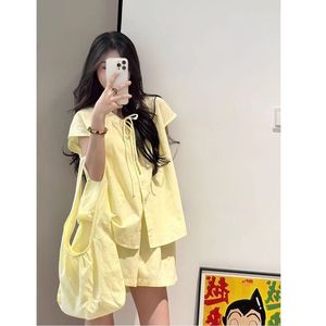 小个子甜美时尚套装女夏季奶黄色宽松系带短袖衬衫上衣阔腿短裤潮