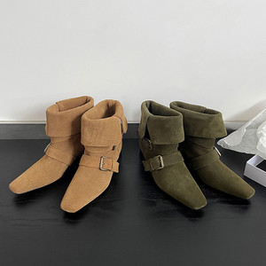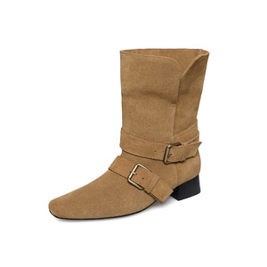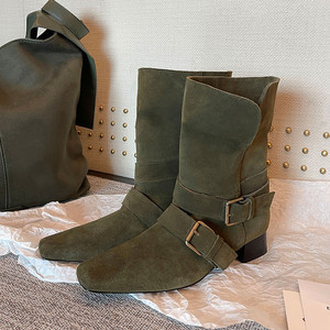牛翻皮马丁靴女皮带扣短靴秋冬新款真皮方头中跟套筒翻边女式短靴