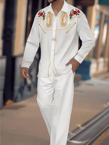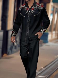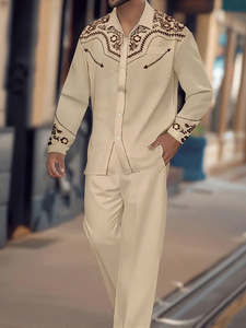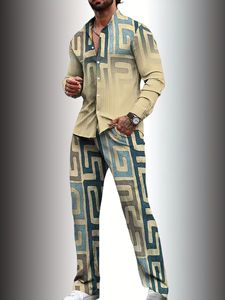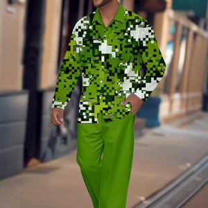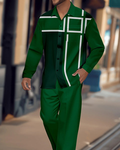 亚马逊男士休闲衬衫3D复古印花时尚秋季长袖衬衫外贸男士长裤套装