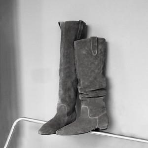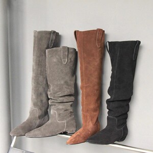 羊皮版~复古平底长靴女气质磨砂宽筒褶皱堆堆靴显瘦百搭骑士靴子