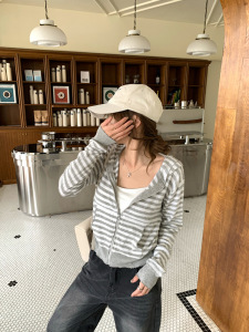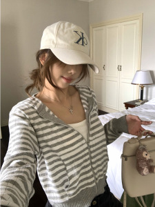 条纹连帽长袖针织衫外套女秋季新款韩系显瘦短款开衫上衣