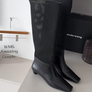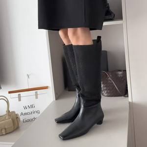 WM6欧洲站女鞋25秋时尚镂空意大利软胎牛皮拼网小方头低粗跟长靴