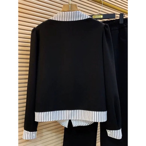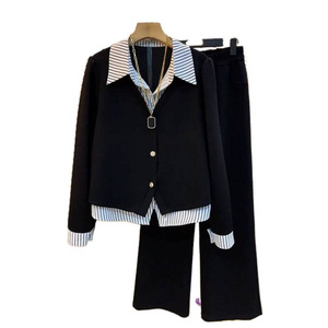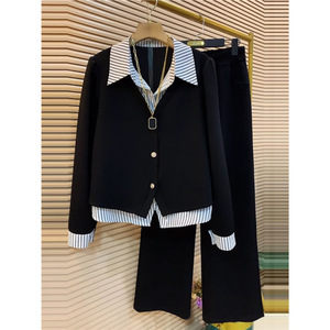 套装女2025春秋新款条纹衬衫领假两件单排扣上衣阔腿裤显瘦两件套