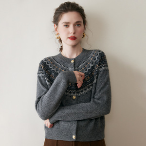 新款复古风山羊绒衫圆领软糯针织开衫费尔岛提花长袖羊毛衫外套女
