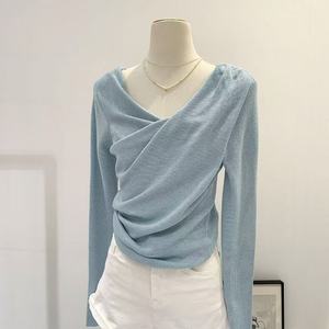 法式别致荡领扭褶斜领显瘦长袖针织衫女初秋温柔风韩系设计感上衣