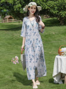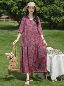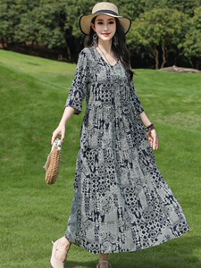 2025新款纯棉绸连衣裙女夏季高级感气质优雅减龄妈妈装人造棉裙子