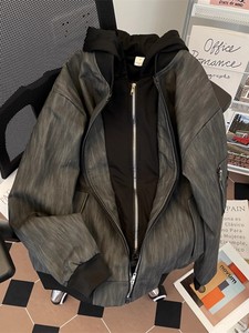 黑灰色纹理拉链连帽假两件皮夹克男款街头宽松百搭外套pu皮衣