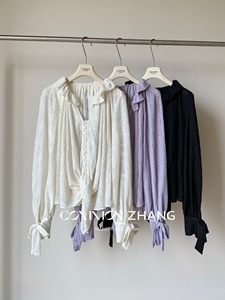 CZ ZHANG秋季韩版肌理感花边v领慵懒松弛微透百搭宽松小衫B33203