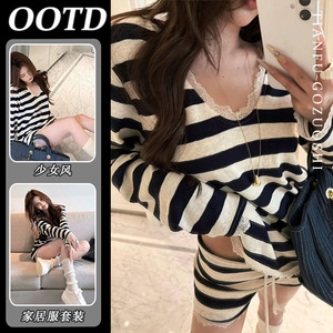 5783-蕾丝花边黑白条纹双短