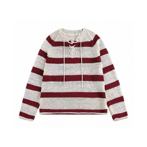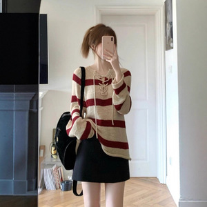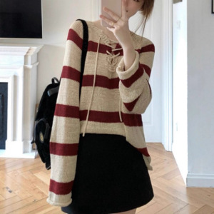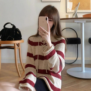 美式复古撞色条纹系带长袖针织衫女2025早秋季新款慵懒风毛衣上衣