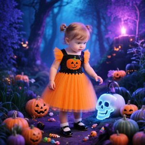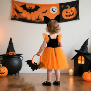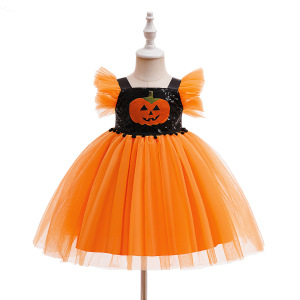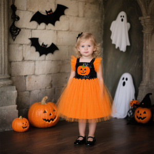 亚马逊新品万圣节女童连衣裙南瓜蛋糕橙色礼服儿童网纱蓬蓬裙礼服