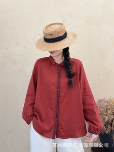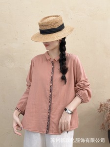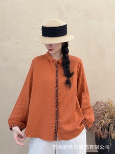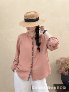 2025秋季新款纯色宽松休闲刺绣百搭软糯双层棉纱长袖衬衫上衣女