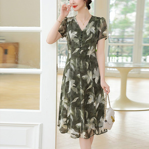 高贵妈妈夏装洋气印花连衣裙2025新款中老年女装过膝显瘦雪纺长裙