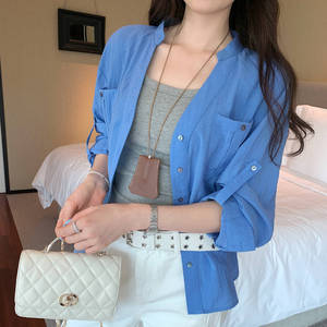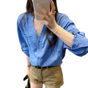 法式绝美亚麻V领蓝色衬衫外套女2025早秋新款高级感chic别致上衣