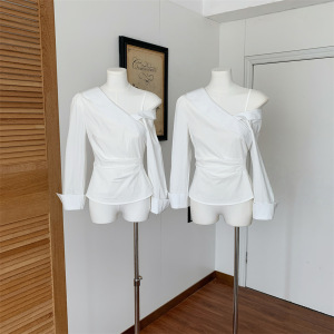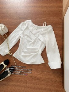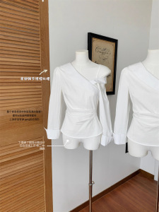 若语同款 耀眼白月光 微弹斜肩修身抽褶衬衫女设计感长袖上衣早秋