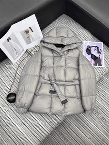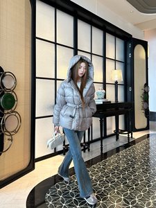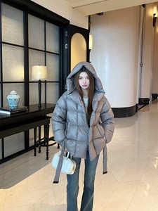 连帽浴袍款羽绒服外套 腰间系腰带设计