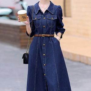 欧货牛仔连衣裙女长袖收腰中长款衬衫裙