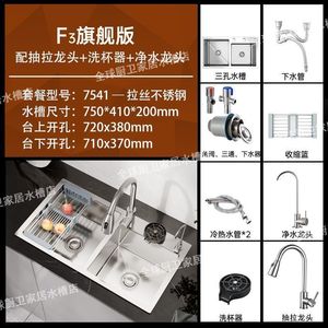 【加厚双槽】75*41 -耐磨防锈款-【拉丝款】抽拉龙头+净水龙头