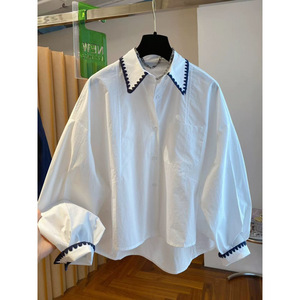 韩里韩气黄色长袖衬衫女早秋2025新款宽松撞色别致花边拼接衬衣