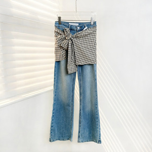 25早秋ann工装风复古做旧直筒格子绑带假两件微喇牛仔裤女