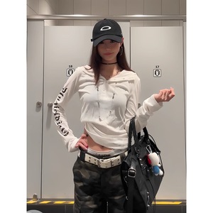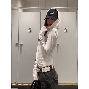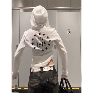 美式朋克长袖连帽t恤女夏季哥特风字母防晒罩衫修身薄纱辣妹上衣