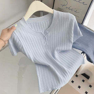 轻薄款蓝色正肩冰丝针织衫短袖女2025夏季穿搭轻熟小众不撞款上衣