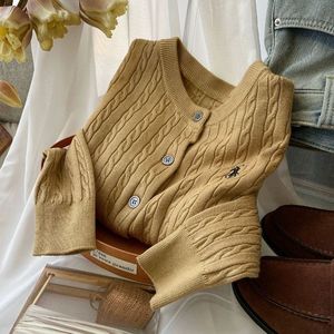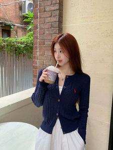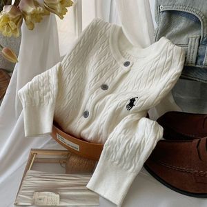 经典复古藏蓝毛麻花刺绣圆领针织开衫韩系百搭通勤白色女上衣批发