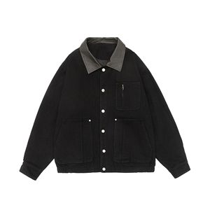 LKTM男装 水洗做旧设计感皮领外套男女纯色百搭重磅翻领夹克上衣